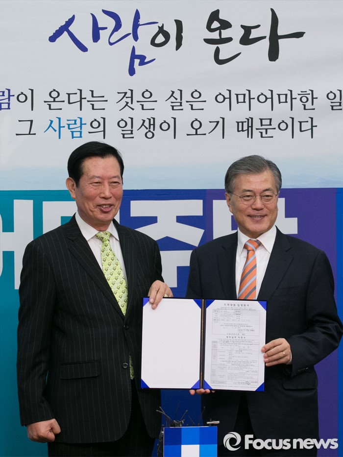 (서울=포커스뉴스) 문재인(오른쪽) 더불어민주당 대표가 14일 오전 서울 여의도 국회에서 열린 인재영입 기자회견에 참석해 하정열 한국안보통일연구원장과 입당원서를 들고 기념촬영을 하고 있다.