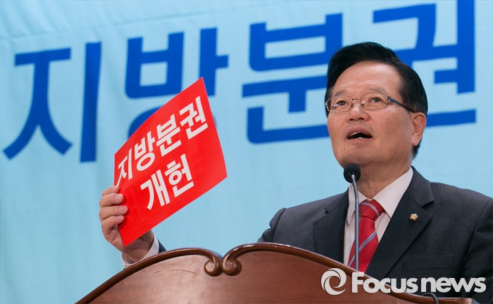(서울=포커스뉴스) 정의화 국회의장이 14일 오후 서울 여의도 국회 의원회관에서 열린 지방분권 개헌 대국민 토론회에 참석해 인사말 도중 피켓을 들어보이고 있다.