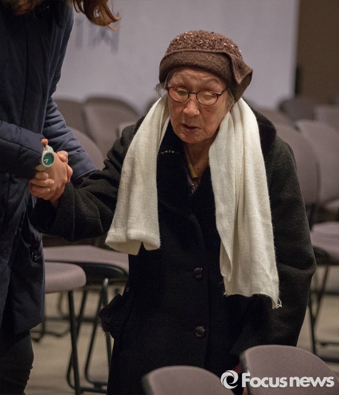 (서울=포커스뉴스) 14일 오후 서울 중구 프레스센터에서 시민사회단체와 학생, 예술 단체 등 사회각계각층이 참여하는 '한일 일본군 위안부 합의 무효와 정의로운 해결을 위한 전국행동' 발족 기자회견을 마친 김복동 할머니가 학생 손에 의지해 자리에서 일어나고 있다.
