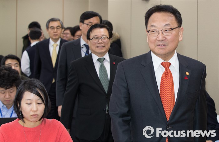 (세종=포커스뉴스) 유일호 경제부총리 겸 기획재정부장관이 14일 오후 세종시 정부세종청사 기획재정부 브리핑룸에서 내수·수출의 균형을 통한 경제활성화 관계부처 합동브리핑을 하기 위해 입장하고 있다.