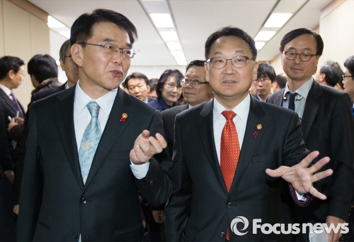 (세종=포커스뉴스) 유일호(오른쪽) 경제부총리 겸 기획재정부장관이 14일 오후 세종시 정부세종청사 기획재정부 브리핑룸에서 내수·수출의 균형을 통한 경제활성화 관계부처 합동브리핑을 마치고 강호인 국토교통부장관과 대화하고 있다.