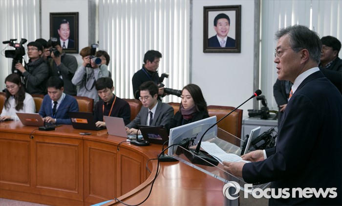 (서울=포커스뉴스) 문재인 더불어민주당 대표가 14일 오후 서울 여의도 국회에서 지난 2012년 대선 당시 박근혜 대통령의 경제민주화 공약을 만든 김종인 전 의원을 조기선대위원장으로 영입한 것과 관련 기자간담회를 하고 있다.