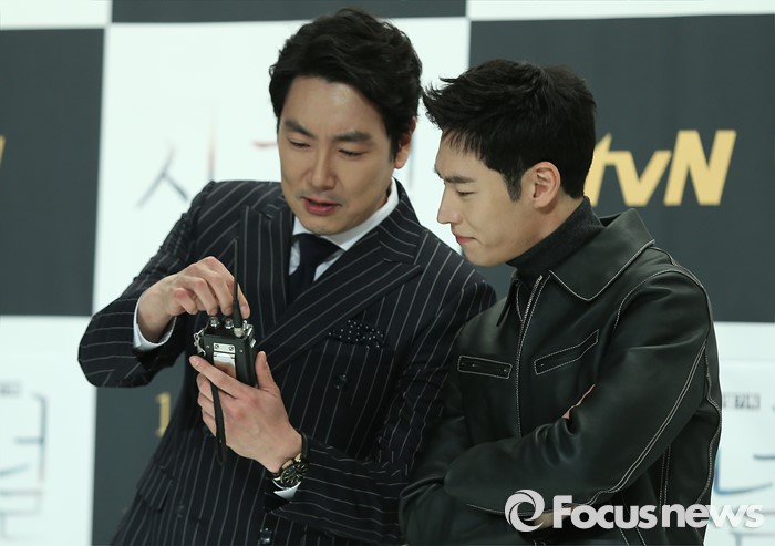 (서울=포커스뉴스) 14일 오후 서울 영등포구 타임스퀘어 아모리스홀에서 열린 tvN 10주년 특별기획 '시그널' 제작발표회에 참석한 배우 조진웅(왼쪽)과 이제훈이 포토타임을 갖고 있다.
