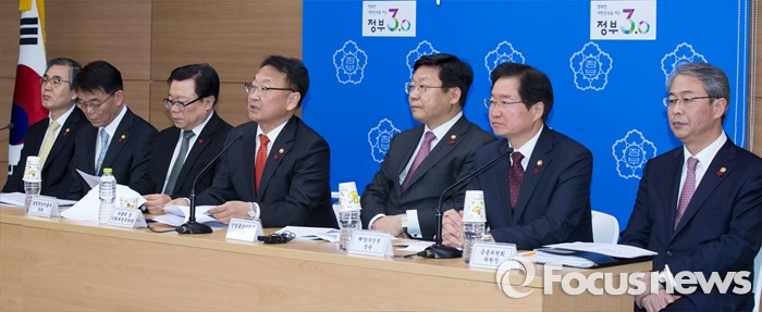 왼쪽부터 정재찬 공정거래위원장, 강호인 국토교통부장관, 이동필 농림축산식품부장관, 유일호 부총리, 주형환 산업통상자원부장관, 김영석 해양수산부장관, 임종룡 금융위원장.