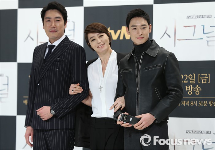 (서울=포커스뉴스) 14일 오후 서울 영등포구 타임스퀘어 아모리스홀에서 열린 tvN 10주년 특별기획 '시그널' 제작발표회에 참석한 배우 조진웅(왼쪽부터), 김혜수, 이제훈이 포토타임을 갖고 있다.