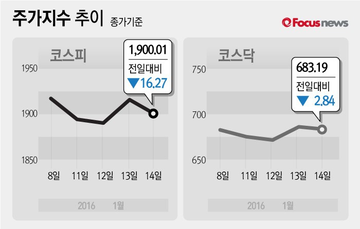 서울=포커스뉴스) 14일 코스피지수는 전날 보다 0.85%(16.27포인트) 내린 1900.01에 장을 마쳤다. 코스닥지수는 전일 대비 0.41%(2.84포인트) 내린 683.19에 마감했다.