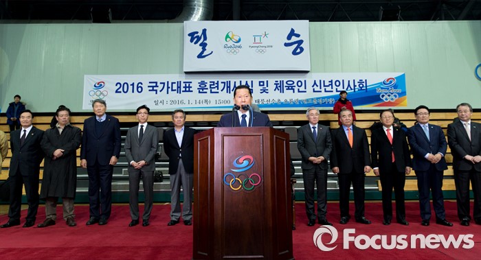 (서울=포커스뉴스) 14일 오후 서울 노원구 태릉선수촌 오륜관에서 열린 2016년 국가대표 훈련개시식 및 체육인 신년인사회에서 김정행 대한체육회 회장이 인사말을 하고 있다.
