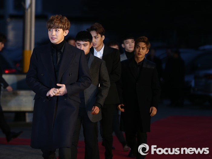 (서울=포커스뉴스) 14일 오후 서울 송파구 올림픽 체조경기장에서 열린 '25회 하이원 서울가요대상' 시상식에 참석한 아이돌 그룹 엑소의 멤버들이 레드카펫위를 걷고 있다.