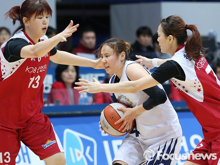 (인천=포커스뉴스) 14일 인천도원체육관에서 열린 2015~2016 여자프로농구 신한은행-KDB생명 경기에서 신한은행 최윤아를 KDB생명 김소담(13)과 한채진이 에워싸며 진로를 봉쇄하고 있다.