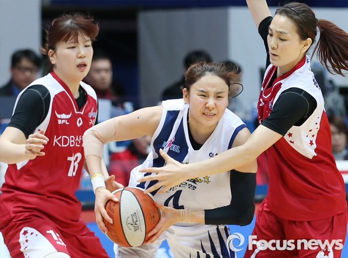 (인천=포커스뉴스) 14일 인천도원체육관에서 열린 2015~2016 여자프로농구 신한은행-KDB생명 경기에서 신한은행 최윤아를 KDB생명 김소담(13)과 한채진이 에워싸며 진로를 봉쇄하고 있다.