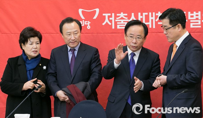 (서울=포커스뉴스) 이주영(오른쪽 두번째) 새누리당 저출산대책특위 위원장과 이동욱(오른쪽) 보건복지부 인구정책실장이 15일 오전 서울 여의도 국회 귀빈식당에서 열린 사교육비 절감방안 논의를 위한 당정협의에 참석해 대화하고 있다. 사진 왼쪽부터 박윤옥 간사, 홍일표 부위원장, 이 위원장, 이 인구정책실장.