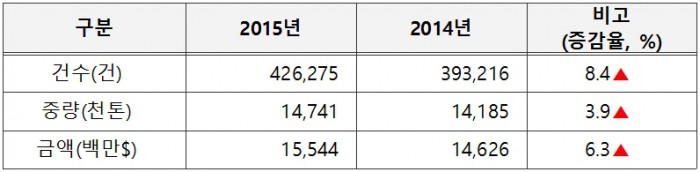 식약처 관계자는 “수입이 지속적으로 증가하고 있다”며 “위해도가 높은 제품이 수입되지 않도록 안전관리를 강화해 국민들의 수입식품에 대한 불안감 해소에 노력하겠다”고 말했다.2014년~2015년 식품 수입현황 <자료출처=식품의약품안전처>
