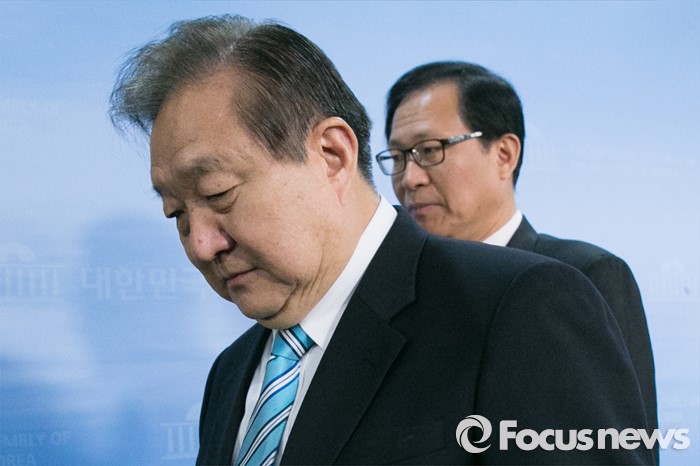 (서울=포커스뉴스) 정대철(앞) 더불어민주당 상임고문이 15일 오전 서울 여의도 국회 정론관에서 탈당 표명 기자회견을 마치고 퇴장하고 있다.