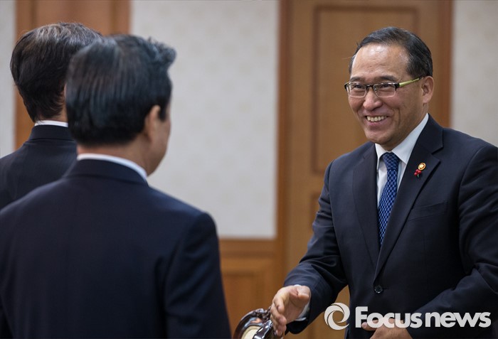 (서울=포커스뉴스) 15일 오전 서울 종로구 정부서울청사에서 열린 국가정책조정회의에 참석한 홍윤식 행정자치부 장관이 박인용 국민안전처 장관과 인사하고 있다.