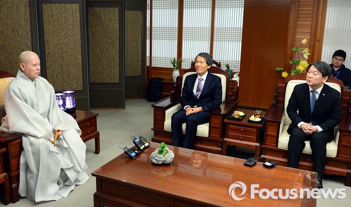 (서울=포커스뉴스) 국민의당 창준위 안철수 인재영입위원장, 한상진(가운데) 창당준비위원장이 15일 오전 서울 종로구 한국불교역사문화기념관을 방문해 불교 조계종 자승 총무원장과 새해 인사를 하고 있다.