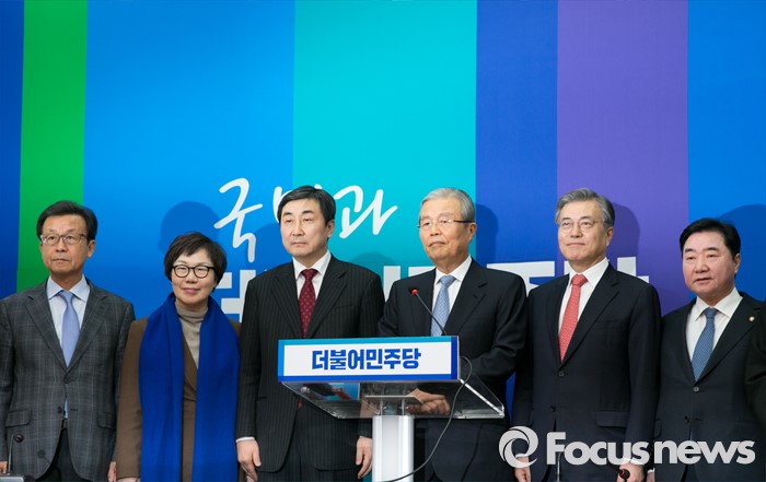 (서울=포커스뉴스) 더불어민주당 조기선대위원장으로 영입된 김종인 전 새누리당 국민행복추진위원장이 15일 오전 서울 여의도 국회에서 기자간담회를 하고 있다. 왼쪽부터 원혜영, 이미경 의원, 이종걸 원내대표, 김 위원장, 문재인 대표, 이석현 국회 부의장.