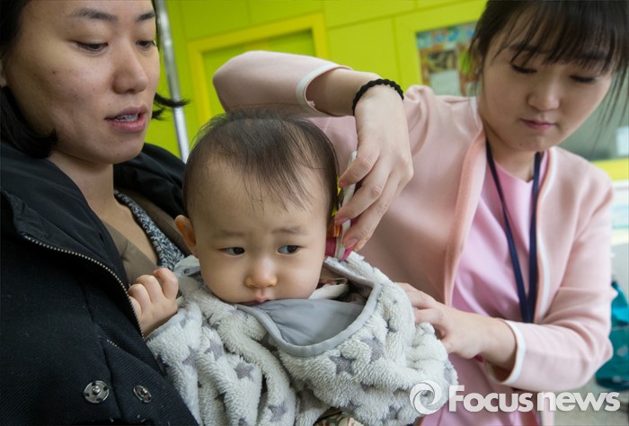 (서울=포커스뉴스) 인플루엔자 유행주의보가 발령된 15일 오전 서울 용산구 소화아동병원에서 한 어린이가 체온을 측정하고 있다.