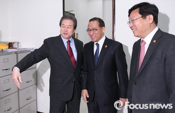 (서울=포커스뉴스) 김무성(왼쪽) 새누리당 대표가 15일 오전 서울 여의도 국회에서 취임 인사 차 방문한 주형환(오른쪽) 산업통상자원부 장관, 홍윤식 행정자치부 장관과 기념촬영을 위해 의원들을 부르고 있다.