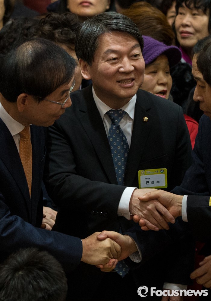 (서울=포커스뉴스) 15일 오후 서울 노원구청 대강당에서 열린 2016 노원구 신년인사회에 참석한 안철수 국민의당 인재영입위원장이박원순 서울시장, 윤득수 노원소방서장과악수하고 있다.