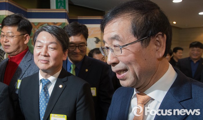 (서울=포커스뉴스) 15일 오후 서울 노원구청 대강당에서 열린 2016 노원구 신년인사회에 참석한 안철수(왼쪽) 국민의당 인재영입위원장과박원순 서울시장이 대화하고 있다.