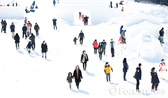 (평창=포커스뉴스) 15일 오후 강원도 평창군 횡계리 일대에서 열린 대관령 눈꽃축제를 찾은 관람객들이 눈으로 만든 조각들을 보며 즐거운 시간을 보내고 있다.