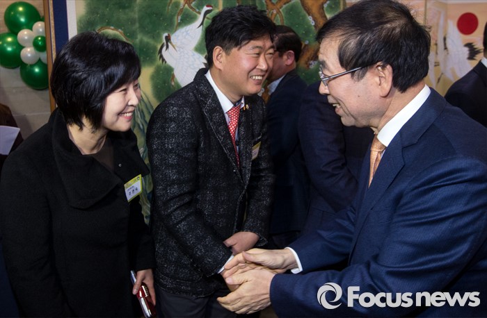 (서울=포커스뉴스) 15일 오후 서울 노원구청 대강당에서 열린 2016 노원구 신년인사회에 참석한 박원순 서울시장이 노원구의회 의원들과 악수하고 있다.