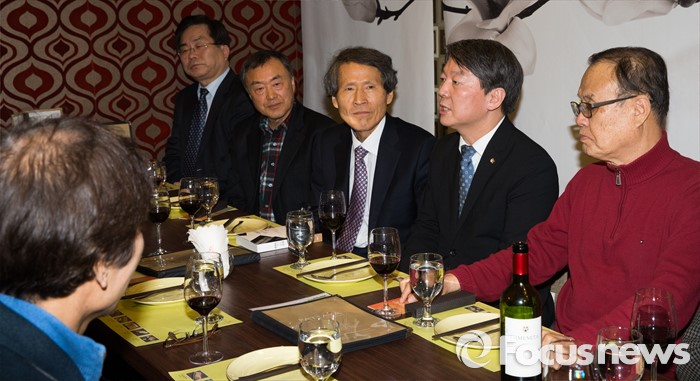 (서울=포커스뉴스) 안철수(왼쪽 두번째) 국민의당 인재영입위원장이 15일 오후 서울 관악구 한 태국 식당에서 진행된 故 김대중 전 대통령 재임 당시 자문정책기획위원회 모임에 참석해 모두발언 하고 있다.