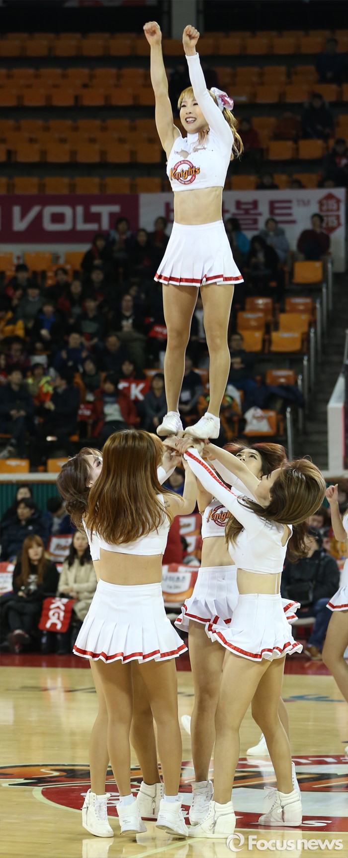 (서울=포커스뉴스) 15일 서울 잠실학생체육관에서 열린 2015-2016 프로농구 SK-KGC 경기에서 SK 치어리더가 경기 시작전 코트의 분위기를 끌어 올리는 스턴트 치어리딩을 공연하고 있다.