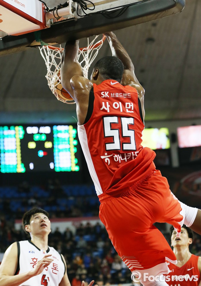 (서울=포커스뉴스) 15일 서울 잠실학생체육관에서 열린 2015-2016 프로농구 SK-KGC 경기에서 SK 사이먼이 스펜서의 고공 패스를 받아 엘리웁 덩크슛을 넣고 있다.박승리에 앞서 리바운드볼을 잡고 있다.