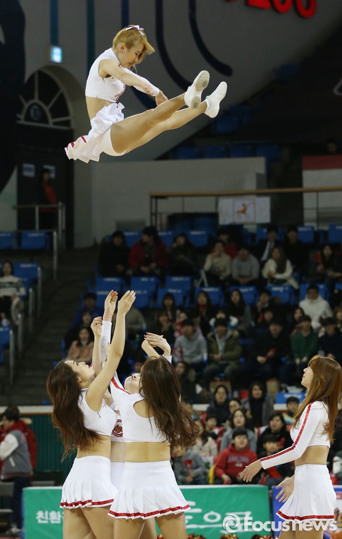 (서울=포커스뉴스) 15일 서울 잠실학생체육관에서 열린 2015-2016 프로농구 SK-KGC 경기에서 SK 치어리더가 경기 시작전 코트의 분위기를 끌어 올리는 스턴트 치어리딩을 공연하고 있다.