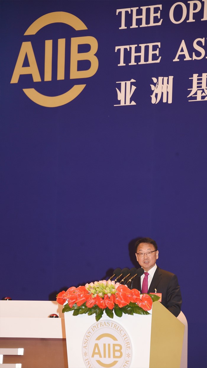 (북경=포커스뉴스) 아시아 인프라 투자은행(AIIB) 창립총회 참석차 중국 북경을 방문중인 유일호 부총리 겸 기획재정부이 16일(현지시간) 조어대에서 열린 개소식에서 축사를 하고 있다. <사진제공=기획재정부>