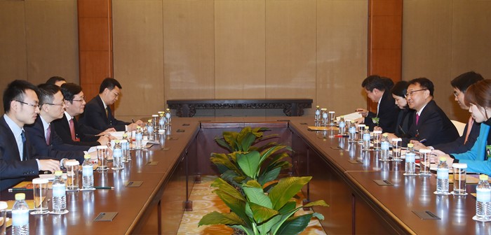 (북경=포커스뉴스) 아시아인프라투자은행(AIIB) 창립총회 참석차 중국 북경을 방문중인 유일호 부총리 겸 기획재정부이 16일 조어대에서 러우 지웨이 중국 재무장관과 양자회담을 하고 있다. <사진제공=기획재정부>