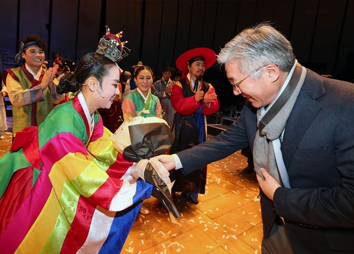 (서울=포커스뉴스) 김종덕 문화체육관광부 장관이 안호상 국립극장장 등 관계자들과16일 서울 국립극장에서 선보인 극장형 마당놀이 ‘춘향이 온다’를 관람하고 배우들을 격려하고 있다. <사진제공=문화체육관광부>
