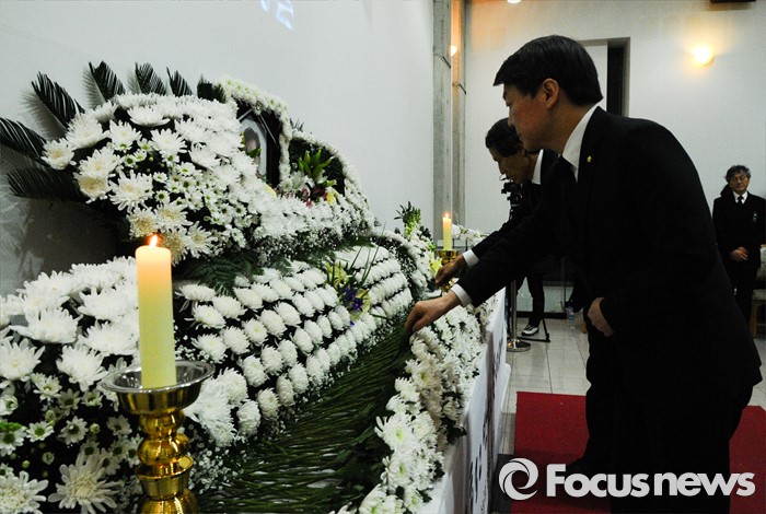 (서울=포커스뉴스) 한상진 국민의당 창당준비위원장과 안철수 인재영입위원장이 16일 오후 서울 구로구 성공회대학교 성미가엘성당에 마련된 故 신영복 성공회대 석좌교수의 빈소를 찾아 헌화하고 있다. <사진제공=성공회대학교>