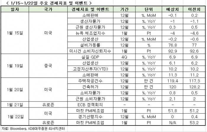 이번주 주목할 이벤트와 경제지표는 ▲중국 4분기 국내총생산(GDP) 발표 ▲유럽중앙은행(ECB) 정책회의 등이 있다.