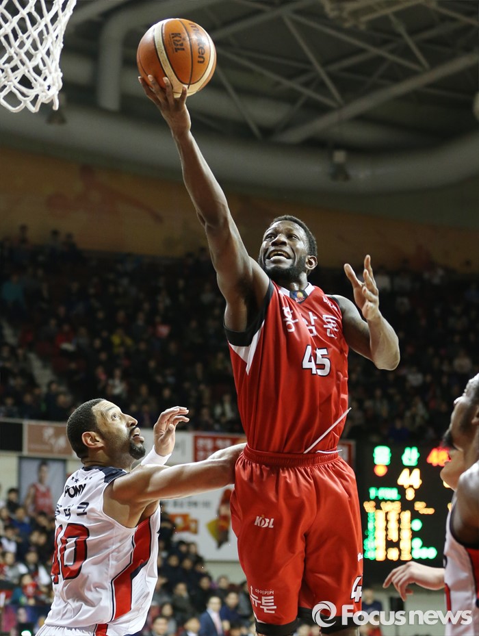 (안양=포커스뉴스) 17일 안양실내체육관에서 열린 2015-2016 프로농구 KGC-모비스 경기에서 KGC 마리오 리틀이 모비스 클라크와 빅터 사이로 레이업슛을 쏘고 있다.
