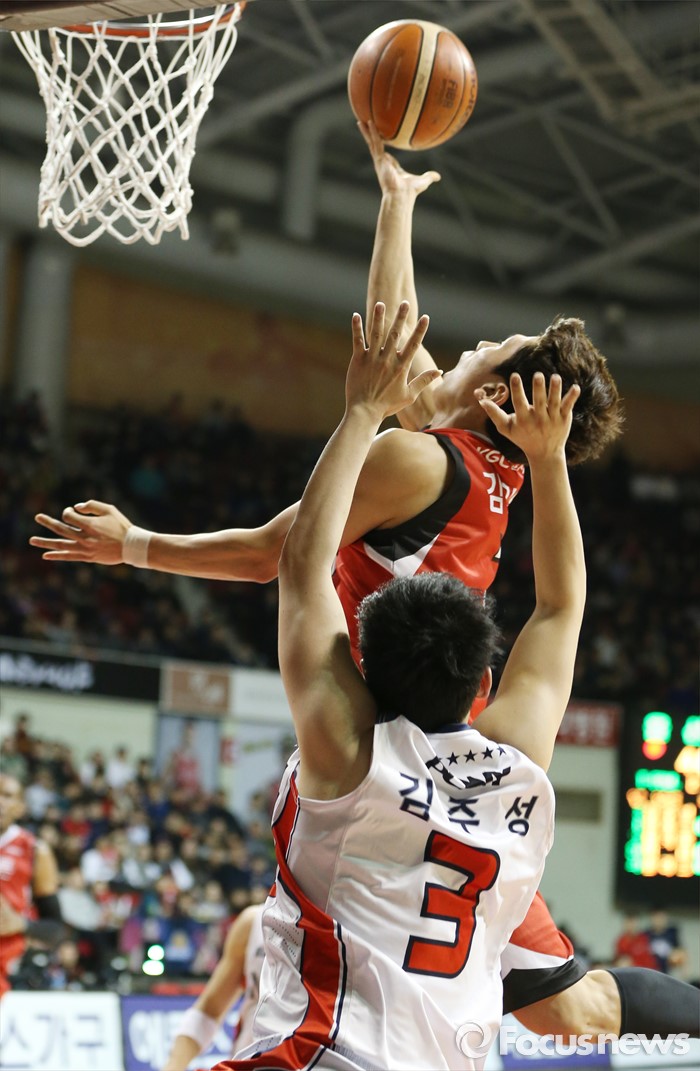(안양=포커스뉴스) 17일 안양실내체육관에서 열린 2015-2016 프로농구 KGC-모비스 경기에서 KGC 김기윤이 모비스 김주성의 마크를 뚫고 레이업슛을 시도하고 있다.
