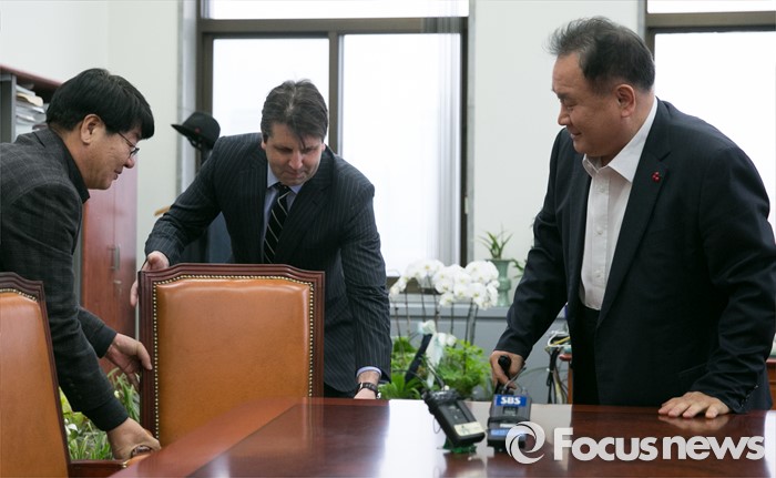 (서울=포커스뉴스) 이상민(오른쪽) 법제사법위원장와 4개국 외교사절(미국, 영국, 호주, EU)을 대표해 방문한 마크 리퍼트(가운데) 주한미국대사가 18일 오전 서울 여의도 국회 위원장실에서 외국법자문사법 개정안과 관련 논의에 앞서 자리에 앉기 위해 준비하고 있다.
