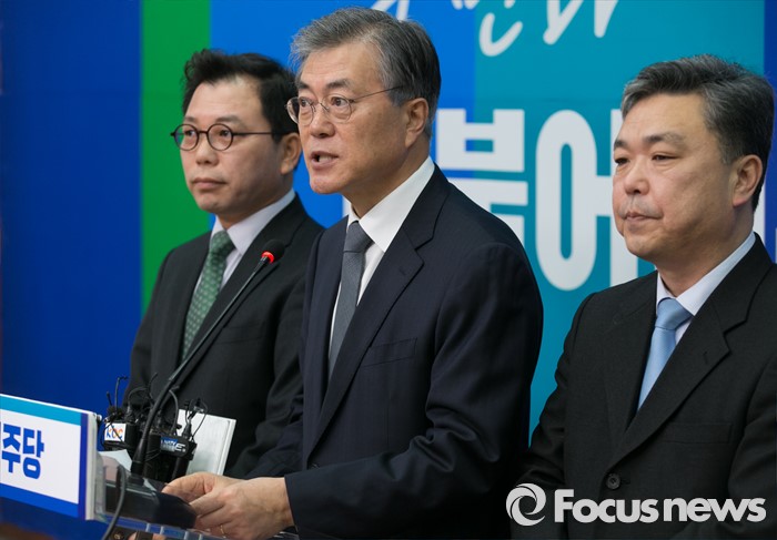 (서울=포커스뉴스) 문재인(가운데) 더불어민주당 대표가 18일 오전 서울 여의도 국회에서 오성규(왼쪽) 전 서울시설관리공단 이사장과 김민영 전 참여연대 사무처장 인재영입 기자회견에 참석해 발언하고 있다.