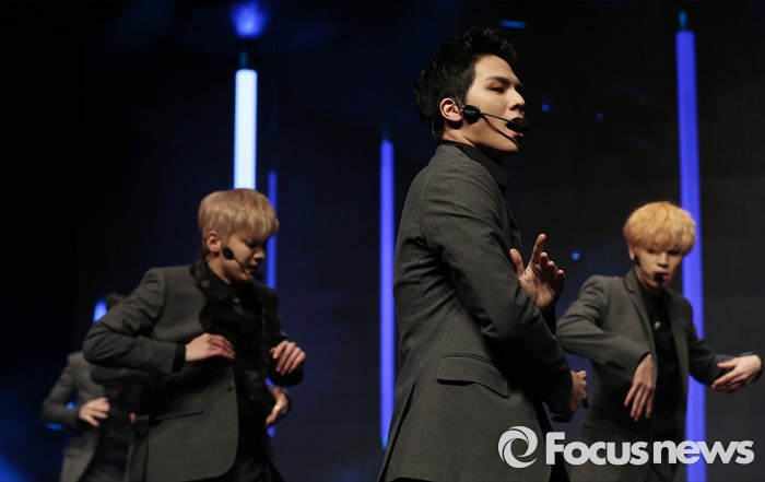 (서울=포커스뉴스) 18일 오전 서울 강남구 일지아트홀에서 열린 아이돌 그룹 틴탑의 미니앨범 'RED POINT' 쇼케이스에 참석한 멤버 캡(오른쪽 두번째)이 신곡 '사각지대'의 무대를 선보이고 있다.