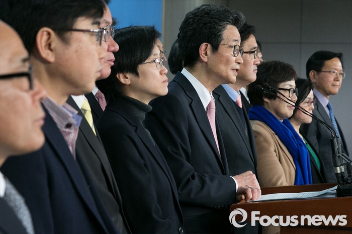 (서울=포커스뉴스) 이목희(앞줄 왼쪽 다섯번째) 더불어민주당 정책위의장을 비롯한 전국직능대표자회의 대표들이 18일 오전 서울 여의도 국회 정론관에서 카드수수료 기습인상 규탄 및 카드수수료 1%법 통과를 촉구하는 기자회견을 하고 있다.