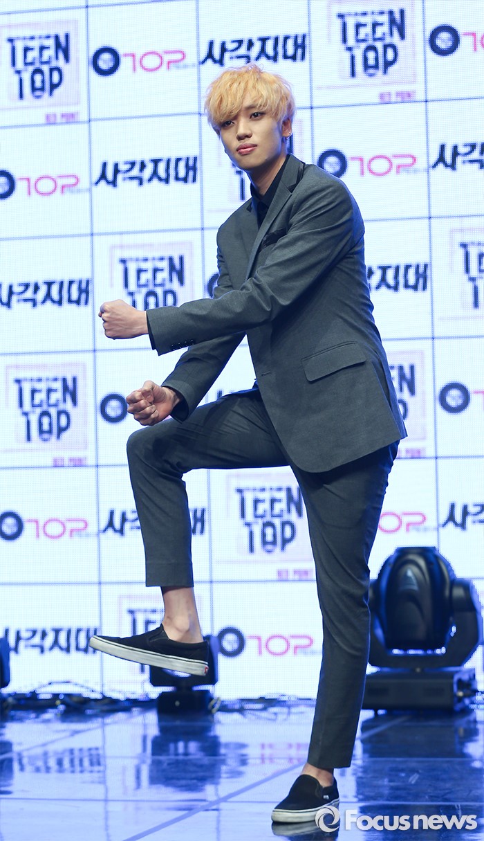 (서울=포커스뉴스) 18일 오전 서울 강남구 일지아트홀에서 열린 아이돌 그룹 틴탑의 미니앨범 'RED POINT' 쇼케이스에 참석한 멤버 니엘이 포토타임을 갖고 있다.