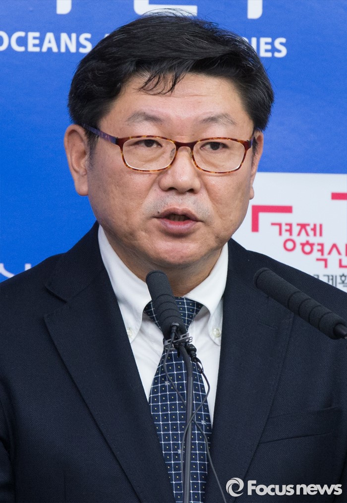(세종=포커스뉴스) 지상범 한국해양과학기술원 해저환경·자원 연구본부장이 18일 오전 세종시 정부세종청사 해수부 기자실에서 브리핑을 열고 심해저에서 채집된 망간단괴를 파이프를 이용해 수면 위 채광선으로 이송하기 위한 시스템(양광시스템)을 개발, 해상 실증시험에 대한 설명을 하고 있다.