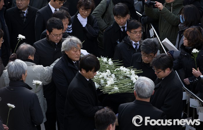 (서울=포커스뉴스) 18일 오후 서울 구로구 성공회대학교에서 엄수된 '故 신영복 석좌교수 영결식'에서 고인의 영정과 유해가 운구되고 있다.