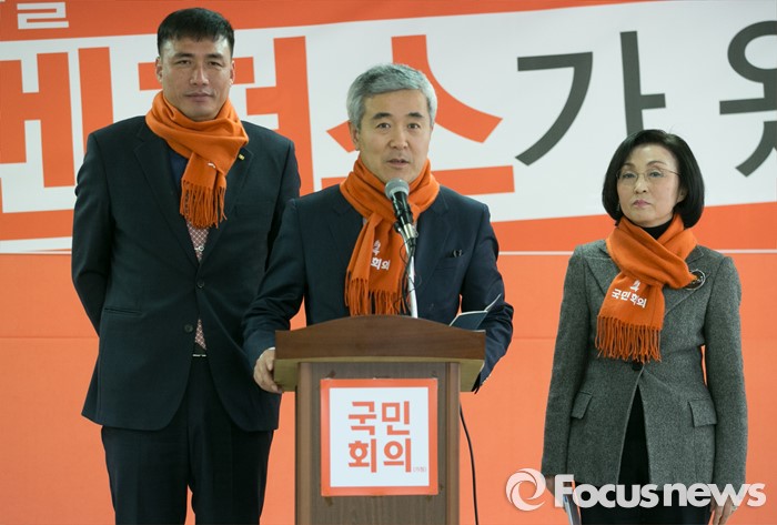 (서울=포커스뉴스) 18일 오후 서울 여의도 당사에서 열린 국민회의 인재입당식에 참석한 김영수(왼쪽부터) 전 해군소령, 채수창 전 화순경찰서장, 장정숙 전 서울시의원이 입당소감을 전하고 있다.