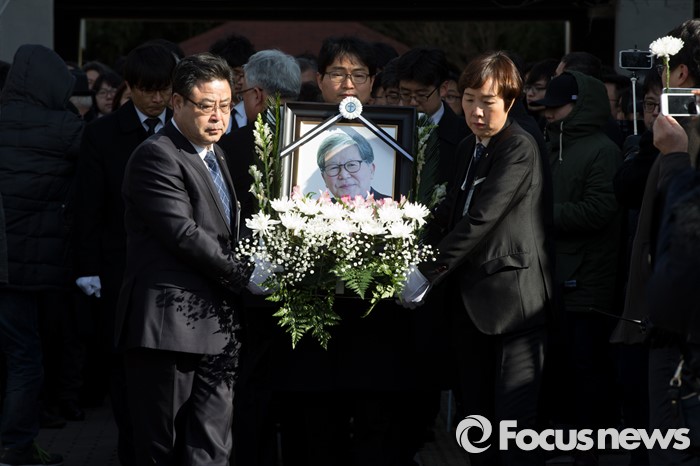 (서울=포커스뉴스) 18일 오후 서울 구로구 성공회대학교 대학성당에서 故 신영복 석좌교수 영결식이 끝나고 고인의 영정과 유해가 운구되고 있다.