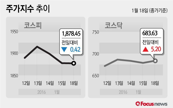 (서울=포커스뉴스) 18일 코스피지수는 전날 보다 0.02%(0.42포인트) 내린 1878.45에 장을 마쳤다. 코스닥지수는 전일 대비 0.77%(5.20포인트) 오른 683.63에 마감했다.