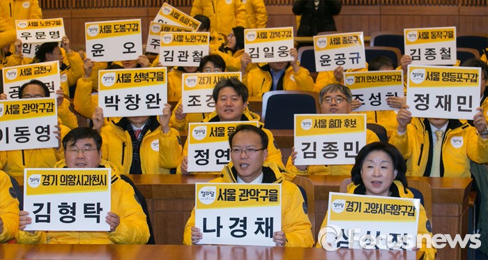 윤공규(서울 종로) 정연욱(서울 용산) 오정빈(서울 동대문갑) 박창완(서울 성북을) 김일웅(서울 강북갑) 윤오(서울 도봉갑) 김관철(서울 노원갑) 김제남(서울 은평을) 임한솔(서울 서대문을) 홍영두(서울 마포을) 이호성(서울 구로갑) 공병권(서울금천) 정재민(서울 영등포갑) 오민애(서울 동작갑) 김종철(서울 동작을) 이동영(서울 관악갑) 나경채(서울 관악을) 권채훈(서울 서초을) 안숙현(서울 송파병) 박치웅(서울 강동갑) 조택상(인천 중구동구옹진군) 정수영(인천 남구을) 김상하(인천 연수) 김민수(인천 남동갑) 배진교(인천 남동을) 김응호(인천 부평을) 김성진(인천 계양갑) 박인숙(인천 계양을) 김중삼(인천 서구강화갑) 박종현(인천 서구강화을) 박원석(경기 수원정) 배준호(경기 성남분당갑) 정진후(경기 안양동안을) 신현자(경기 부천소사) 구자호(경기 부천오정) 문현수(경기 광명갑) 이병렬(경기 광명을) 송치용(경기 평택갑) 조성찬(경기 안산단원갑)이재용(경기 안산단원을) 심상정(경기 고양덕양갑) 김형탁(경기 의왕과천) 조경호(경기 시흥을) 김동현(경기 군포) 박상보(경기 하남) 하태옥(경기 용인병)18일 오전 서울 여의도 국회 헌정기념관에서 열린 정의당 2016 총선 수도권 후보 발대식에 참석한 심상정 상임대표 등 후보들이 자신의 이름이 적힌 피켓을 들고 총선 승리를 다짐하고 있다. 2016.01.18 박동욱 기자