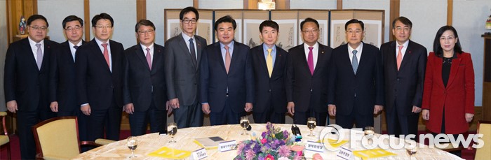 (서울=포커스뉴스) 19일 오전 서울 종로구 삼청동 국무총리공관에서 열린당·정·청 정책조정협의회에서 왼쪽부터 안종범 청와대 경제수석, 이기권 고용노동부 장관, 권성동 새누리당 전략기획본부장, 조원진 새누리당 원내수석부대표, 이준식 사회부총리 겸 교육부 장관, 원유철 새누리당 원내대표, 현정택 청와대 정책조정수석, 유일호 경제부총리 겸 기획재정부 장관, 김정훈 새누리당 정책위의장, 이석준 국무조정실장, 김현숙 청와대 고용복지수석이 기념촬영을 하고 있다.