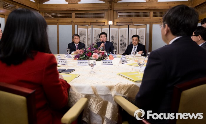 (서울=포커스뉴스) 19일 오전 서울 종로구 삼청동 국무총리공관에서 열린당·정·청 정책조정협의회에 참석한 원유철(가운데) 새누리당 원내대표가 모두발언을 하고 있다.